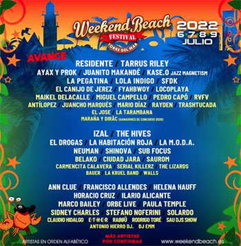 TORRE DEL MAR – Het Weekend Beach-muziek festival in de kustplaats Torre del Mar wordt in 2022 gehouden van woensdag 6 tot en met zaterdag 9 juli. Dit bevestigden de organisatoren op vrijdag 12 november. Het betreft de veertiende editie van het populaire festival, dat dit jaar net als veel andere evenementen noodgedwongen werd afgelast vanwege de Corona-pandemie.