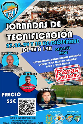 NERJA – Op de kunstgrasvelden van het voetbalstadion Pepe Luis Bobadilla houdt de Escuela Municipal de Fútbol van Nerja van maandag 27 tot met donderdag 30 december de zogeheten Jornadas de Tecnificación de Futbol. Dit voetbaltrainingskamp staat open voor spelers van zes tot 13 jaar en wordt dagelijks afgewerkt tussen 10.00 en 14.00 uur.