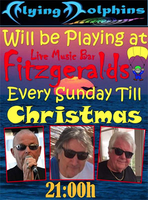 NERJA – De regionaal vermaarde band The Flying Dolphins treedt tot de Kerst iedere zondagavond op bij Fitzgerald’s Bar, op de hoek van park Verano Azul (Calle Antonio Ferrandis Chanquete) onder het pand van de Super Sol-supermarkt in Nerja.