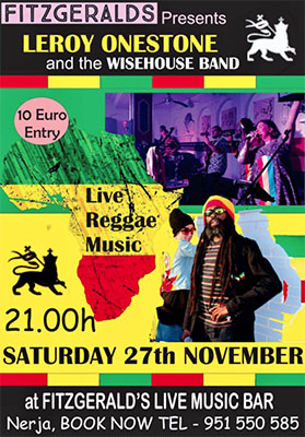 NERJA – De reggae-artiest Leroy Onestone met zijn Wisehouse Band is zaterdagavond 27 november te beluisteren in Nerja bij Fitzgerald’s Bar, op de hoek van park Verano Azul onder het pand van de Super Sol-supermarkt in Nerja.