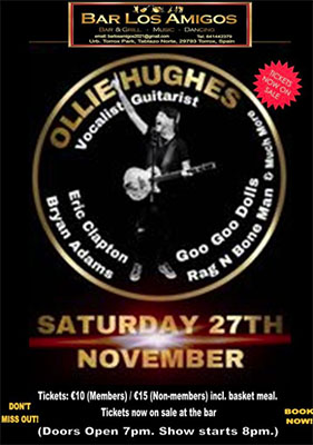 TORROX – In bar Los Amigos (Torrox) staat zaterdagavond 27 november een optreden gepland van de zanger en gitarist Ollie Hughes. De avond begint om circa 20.00 uur en duurt tot circa 23.00 uur.