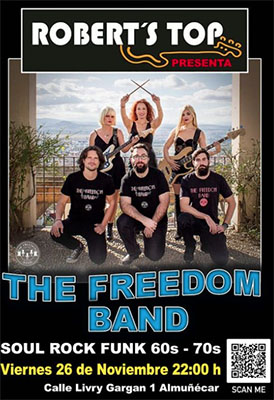 ALMUNECAR – Bij bar/restaurant Robert’s Top in Almuñécar staat vrijdagavond 26 november een optreden geprogrammeerd van The Freedom Band. Het optreden begint rond 22.00 uur en duurt tot circa middernacht.