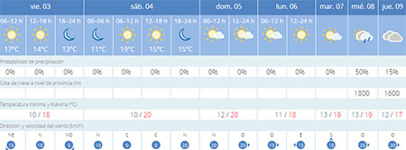 Ook voor het begin van de volgende week voorzien de weerkundigen aangenaam weer aan de Costa del Sol met gemiddelde dagtemperaturen die tegen de grens van twintig graden Celsius aanhikken. Later in de week bestaat er wel een kleine kans op regenval rond Nerja, waarbij naar verwachting de wind in kracht toeneemt.