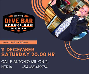 NERJA – Bij de vorige week geopende Dive Bar in het centrum van Nerja treedt zaterdag 11 december de zanger Juan Luis Pascual Sanchez op. Het optreden begint rond de klok van 20.00 uur en is gratis toegankelijk.
