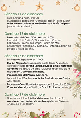 NERJA – Als onderdeel van het gemeentelijk kerstprogramma in de binnenstad van Nerja trekt het koor El Sarao zondagavond 12 december door de binnenstad van Nerja. Het vertrek staat gepland om 18.00 uur vanaf het uitgaansplein Tutti Frutti.