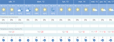 Van neerslag is dit weekeinde én de eerste helft van de komende week geen sprake in de huidige vooruitzichten. Daarin regeert de zon aan de kust rond Nerja tot woensdag 15 december, later in de week kan er sprake zijn van passerende wolkendekken. De gemiddelde dagtemperaturen blijven daarbij gedurende de komende week schommelen rond de grens van twintig graden Celsius.