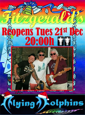 NERJA – De regionaal vermaarde band The Flying Dolphins treedt dinsdagavond 21 december op tijdens de heropening van Fitzgerald’s Bar, op de hoek van park Verano Azul (Calle Antonio Ferrandis Chanquete) onder het pand van de supermarkt.