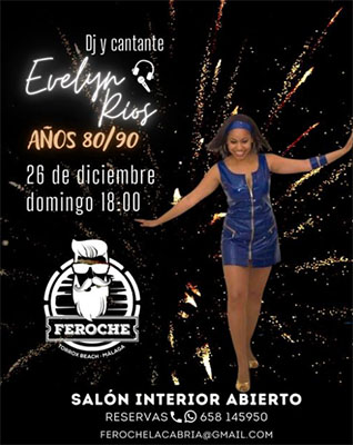TORROX – De zangeres Evelyn Rios treedt zondag 26 december op bij restaurant Feroche in de kustplaats Torrox. Restaurant Feroche is te vinden aan de Paséo Maritímo in Torrox-Costa. Het optreden begint rond de klok van 18.00 uur.