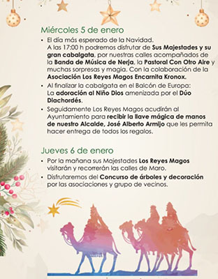 NERJA – De jaarlijkse intocht van de Reyes Magos (het grote feest rond Driekoningen, wat in Spanje vergelijkbaar is met het Nederlandse Sinterklaasfeest, red.) is voor Nerja gepland op woensdag 5 januari. De stoet, onder muzikale begeleiding van de Banda de Música de Nerja, wordt rond 17.00 uur verwacht in het centrum van Nerja.