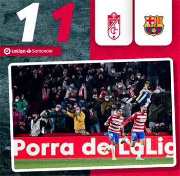 GRANADA – Voor de tweede keer in deze voetbalcompetitie voor de Spaanse Primera División is FC Barcelona er niet in geslaagd zich te ontdoen van Granada CF. Na negentig minuten voetbal stond er, evenals na de eerste ontmoeting in Barcelona in september vorig jaar, zaterdagavond 8 januari een 1-1 eindstand op het sorebord. Barcelona eindigde het duel met tien spelers, nadat Pablo Martín Páez Gavira (voetbalnaam ´Gavi´) tien minuten voor tijd met een rode kaart (na 2x geel) van het veld werd gestuurd.