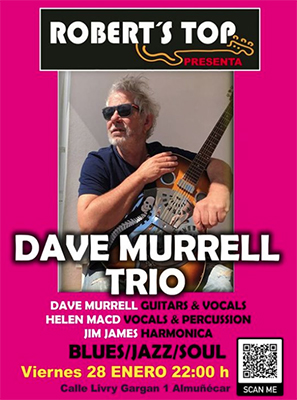 ALMUNECAR – In bar/restaurant Robert’s Top in Almuñécar staat vrijdagavond 28 januari een optreden geprogrammeerd van het Dave Murrell Trio. Het optreden begint rond 22.00 uur.
