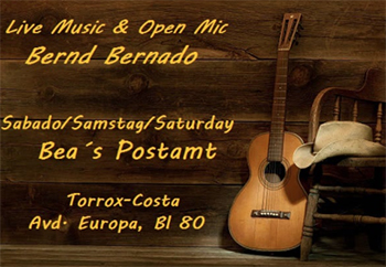 Gitarist en zanger Bernd Bernado treedt op bij Bea’s Postamt TORROX – De gitarist/zanger Bernd Bernado treedt zaterdagavond 29 januari op bij de Music & Cocktail Bar Bea’s Postamt in de kustplaats Torrox. De bar is te vinden aan de Avenida Europa (Bloque 80), het optreden begint rond 20.00 uur. Delen: Klik om te delen op X (Opent in een nieuw venster) X Klik om te delen op Facebook (Opent in een nieuw venster) Facebook Vind-ik-leuk Aan het laden...
