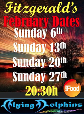 NERJA – De regionaal vermaarde band The Flying Dolphins treedt ook in februari iedere zondagavond op bij Fitzgerald’s Bar, op de hoek van park Verano Azul (Calle Antonio Ferrandis Chanquete) onder het pand van de Carrefour-supermarkt in Nerja.