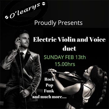 TORROX – Het Duo Electric Violin and Voice treedt zondagmiddag 13 februari op in de kustplaats Torrox, op circa tien kilometer van Nerja gelegen. Dit gebeurt in O’Leary’s Irish Bar aan de Paseo Marítimo de Ferrara.