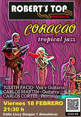 ALMUNECAR – Bij bar/restaurant Robert’s Top in de kustplaats Almuñécar staat vrijdagvond 18 februari een optreden geprogrammeerd van de formatie Coração. Het optreden begint rond 22.00 uur en duurt tot circa middernacht.
