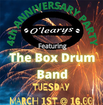 TORROX – Het jubileumfeest van de Ierse bar O´Leary´s wordt dinsdagmiddag 1 maart gevierd met een optreden van de Box Drum Band. De bar bestaat dan vier jaar. O´Leary´s is gevestigd aan de Paseo Marítimo de Ferrara in de kustplaats Torrox.