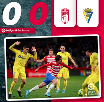 GRANADA – In de Spaanse Primera División morste voetbalclub Granada CF maandagavond 28 februari dure punten in het thuisduel tegen staartclub Cadiz. In het eigen stadion Nuevo Los Cármenes kwam de Andalusische club niet verder dan een 0-0 puntendeling.
