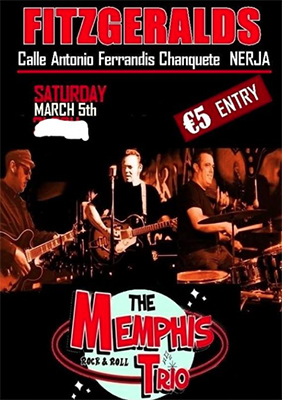 NERJA – Bij Bar Fitzgerald’s, op de hoek van park Verano Azul onder het pand van de Carrefour-supermarkt in Nerja , treedt zaterdagavond 5 maart het Memphis Trio op. De formatie speelt voornamelijk rock and roll-muziek.