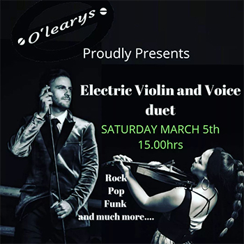 TORROX – Het duo Electric Violin and Voice treedt zaterdagmiddag 5 maart op in de kustplaats Torrox, op circa tien kilometer van Nerja gelegen. Dit gebeurt in O’Leary’s Irish Bar aan de Paseo Marítimo de Ferrara.