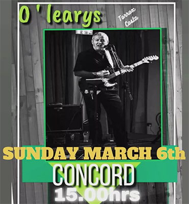 TORROX – In Torrox-Costa treedt zondagmiddag 6 maart de Ierse zanger en gitarist Concord op. Dit gebeurt in O’Leary’s Irish Bar aan de Paseo Marítimo de Ferrara.
