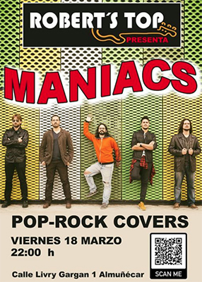 ALMUNECAR – In bar/restaurant Robert’s Top in Almuñécar staat vrijdag 18 maart een optreden geprogrammeerd van de band The Maniacs. Het optreden begint rond 22.00 uur.