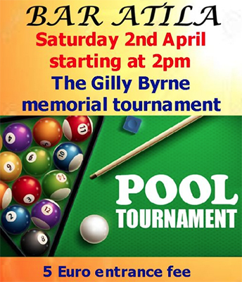 PUENTE DON MANUEL – In Puente Don Manuel staat begin april bij Bar Atila een poolbiljart-toernooi onder de naam ´Gilly Byrne Memorial Pool Tournament´ op het programma. Aanmelden voor deelname kan ter plekke tot vrijdag 25 maart, de kosten bedragen vijf euro per speler.