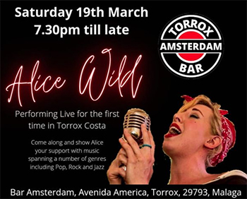 TORROX – In de kustplaats Torrox, op circa tien kilometer van Nerja gelegen, treedt zaterdag 19 maart de zangeres Alice Wild op. Dit gebeurt bij Bar Amsterdam aan de Avenida America in Torrox-Costa.