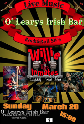 TORROX – De rockabilly-formatie Willie & The Inmates treedt zondagmiddag 20 maart op bij O’Leary´s Irish Bar aan de Paseo Marítimo de Ferrara in de kustplaats Torrox, op circa tien kilometer van Nerja gelegen.