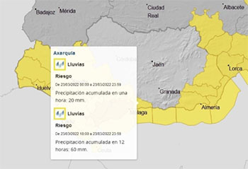 NERJA – De meteorologische dienst Aemet (Agencia Estatal de Meteorología) heeft een code geel-waarschuwing afgegeven voor de regio Axarquía (waartoe onder meer Nerja behoort) voor de periode tussen middernacht op dinsdag 22 maart en 12.00 uur op donderdag 24 maart.