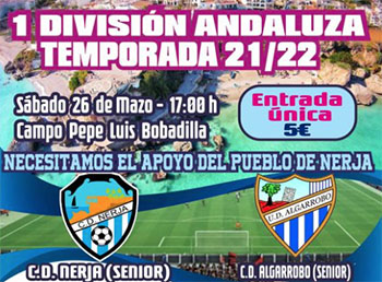 Nerja heeft daarbij een overwinning nodig om dreigende degradatie in de slotfase van de competitie alsnog af te wenden. De wedstrijd begint zaterdag om 17.00 uur, entreebewijzen kosten vijf euro per stuk. CD Nerja staat op de huidige ranglijst van deze competitie (met achttien clubs, red.) op de zestiende plaats met 22 punten uit 26 wedstrijden, Algarrobo staat op de zevende plaats met 43 punten uit 25 wedstrijden.