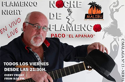 NERJA – De gitarist Paco ´El Apañao´ treedt dit voorjaar wekelijks op vrijdagavonden op in cocktailbar Malibú aan de Calle Málaga 13 in Nerja. Daarbij wordt voornamelijk flamencomuziek ten gehore gebracht.