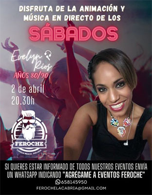TORROX – De zangeres Evelyn Rios treedt zaterdag 2 april op bij restaurant Feroche in de kustplaats Torrox. Restaurant Feroche is te vinden aan de Paséo Maritímo in Torrox-Costa. Daarbij herleven zaterdagavond de jaren ´80 en ´90 qua muziek.