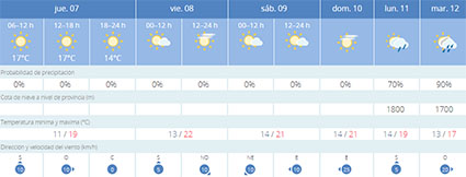Dit blijkt uit de huidige vooruitzichten van het weerstation Aemet (Agencia Estatal de Meteorología). Het weekeinde belooft vooralsnog vooral zonnig te worden met temperaturen die de grens van de 20 graden regelmatig overstijgen. Wél wordt er met ingang van maandag 11 april opnieuw regen voorspeld, waarbij de temperaturen weer iets zakken.