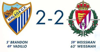 De tweede helft was amper vier minuten oud of Málaga liet een tweede treffer optekenen. Deze kwam op naam van Álvaro Vadillo: 2-0. Toch slaagde de thuisclub er niet in de winst over de streep te trekken. Shon Weissman bracht met twee doelpunten (in de 59ste en 63ste minuut) Valldolid langszij, met een 2-2 eindstand als gevolg.