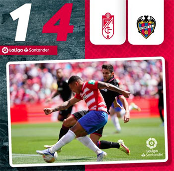 Alex Collado deed in de slotminuut nog wat terug voor Granada (1-3) maar in de blessuretijd tilde voormalig Granada-speler Roberto Soldado het verschil toch weer naar drie doelpunten (1-4) in het voordeel van Levante.