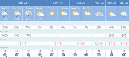 De gemiddelde dagtemperatuur hikt de komende dagen aan tegen de grens van 20 graden Celsius, de wind is matig en wakkert bij vlagen aan tot krachtig. Na zaterdag blijft in het de voorspellingen van Aemet een aantal dagen droog, wél wordt er met ingang van donderdag 28 april opnieuw neerslag voorspeld.
