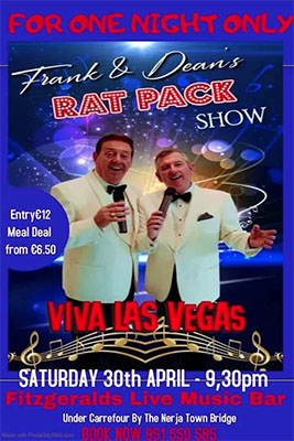 NERJA – Het duo Frank and Dean treedt zaterdagavond 30 april op met hun zogeheten Rat Pack Viva Las Vegas Show bij Fitzgerald’s Bar, op de hoek van park Verano Azul onder het pand van de Carrefour-supermarkt in Nerja.