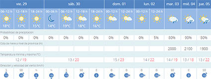 Dit voorspelt de Spaanse meteorologische dienst Aemet (Agencia Estatal de Meteorología) in haar meest recente weersvooruitzichten. Na maandag 2 mei is het echter alweer gedaan met het fraaie voorjaarsweer, Aemet voorziet nieuwe regenbuien gedurende de komende week. De wind laat het, met uitzondering van maandag 2 mei, voorlopig grotendeels afweten.