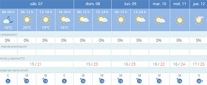 NERJA – Na een regenachtige periode lijkt de zon de regie weer te hebben overgenomen boven Nerja en naaste omgeving. Komend weekeinde loopt de gemiddelde dagtemperatuur op naar 23 graden Celsius, in de daarop volgende week wordt nog wat warmer. Dit voorzien de meteorologen van het weerstation Aemet (Agencia Estatal de Meteorología) in hun jongste weersvoorspellingen.