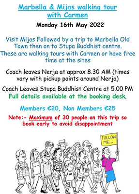 NERJA – De Club Internacional Nerja, een sociale en culturele organisatie die zich onder meer bezig houdt met het organiseren van trips vanuit Nerja, heeft voor maandag 16 mei een dagtrip per bus uitgezet vanuit Nerja naar Marbella en Mijas.