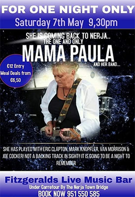 NERJA – De Mama Paula Bluesband treedt zaterdagavond 7 mei op in Nerja. Dit gebeurt bij Fitzgerald’s Bar, op de hoek van park Verano Azul (Calle Antonio Ferrandis Chanquete) onder het pand van de Carrefour-supermarkt in Nerja.