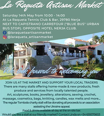 NERJA – Op de terreinen van de padel- en tennisclub La Raqueta in Nerja staat zaterdag 14 mei een ambachtsmarkt gepland.