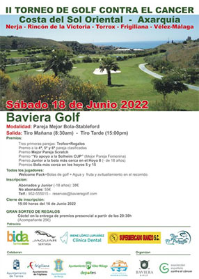 VELEZ-MALAGA – Op de terreinen van de Baviera Golf-club bij Vélez-Málaga staat zaterdag 18 juni de tweede editie van het ´Torneo de Golf contra el cancer´ op de rol. Het toernooi begint om 08.30 uur in de ochtend en duurt tot circa 15.00 uur in de middag.