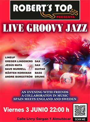 ALMUNECAR – Bij bar/restaurant Robert’s Top in Almuñécar staat vrijdagavond 3 juni een zogeheten ´Groovy Jazz-avond´ geprogrammeerd. Het optreden begint rond 22.00 uur en duurt tot circa middernacht.