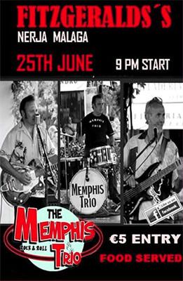 NERJA – Bij Fitzgerald’s Bar, op de hoek van park Verano Azul onder het pand van de Carrefour-supermarkt in Nerja , treedt zaterdagavond 25 juni het Memphis Trio op. De formatie speelt voornamelijk rock and roll-muziek.
