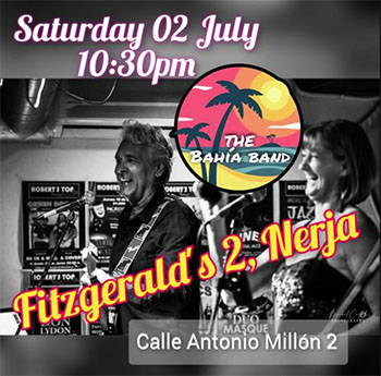 NERJA – The Bahía Band treedt zaterdagavond 2 juli op bij Fitzgerald’s Bar II aan de Calle Antonio Millón 2 in het centrum van Nerja.