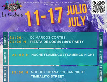 La Cochera is gevestigd aan de Paseo Andrès Segovia, het optreden begint om 23.00 uur. Timbalito Street, onder leiding van ‘The Piano man’ Lino Díaz, brengt vooral Latijns-Amerikaanse en jazz-muziek ten gehore.