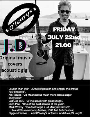 TORROX – De zanger en gitarist JD treedt vrijdagavond 22 juli op in de kustplaats Torrox, op circa tien kilometer van Nerja gelegen. Dit gebeurt in O’Leary’s Irish Bar aan de Paseo Maritímo de Ferrara.