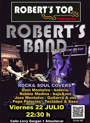 ALMUNECAR – In bar/restaurant Robert’s Top in Almuñécar staat vrijdagavond 22 juli een optreden geprogrammeerd van Robert´s Band. Het optreden begint rond 22.30 uur.