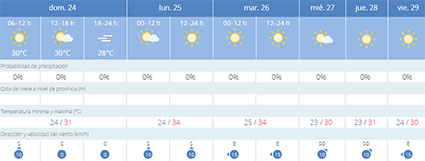 NERJA – De meteorologen van het weerstation Aemet (Agencia Estatal de Meteorología) verwachten dat de temperaturen rond Nerja de komende week nog iets verder oplopen. Voor maandag 25 en dinsdag 26 juli zou de gemiddelde dagtemperatuur in die vooruitzichten oplopen tot 34 graden Celsius, terwijl voor de rest van de week gemiddelde waarden van dertig graden worden verwacht.